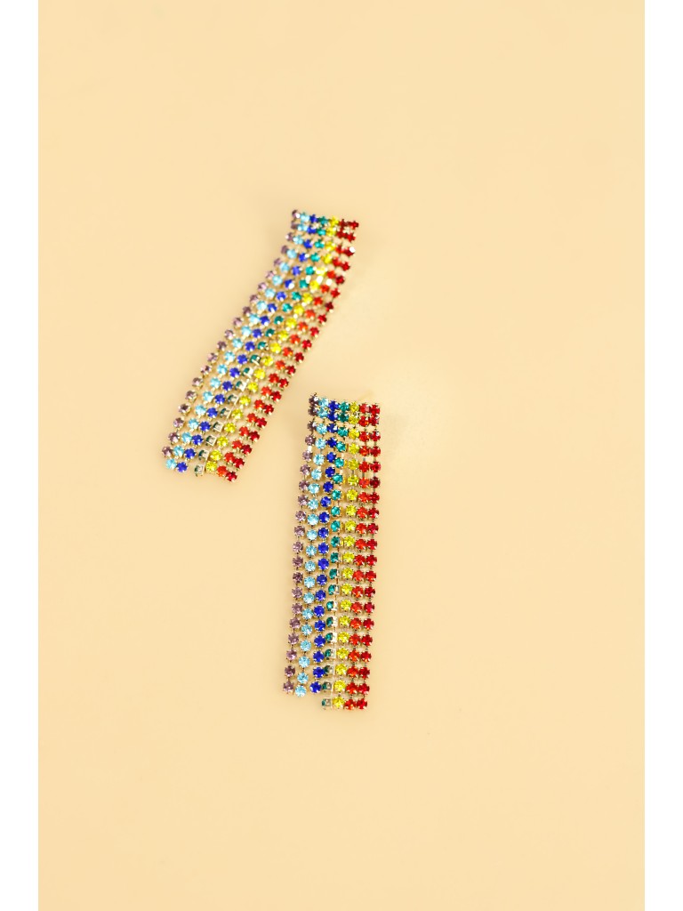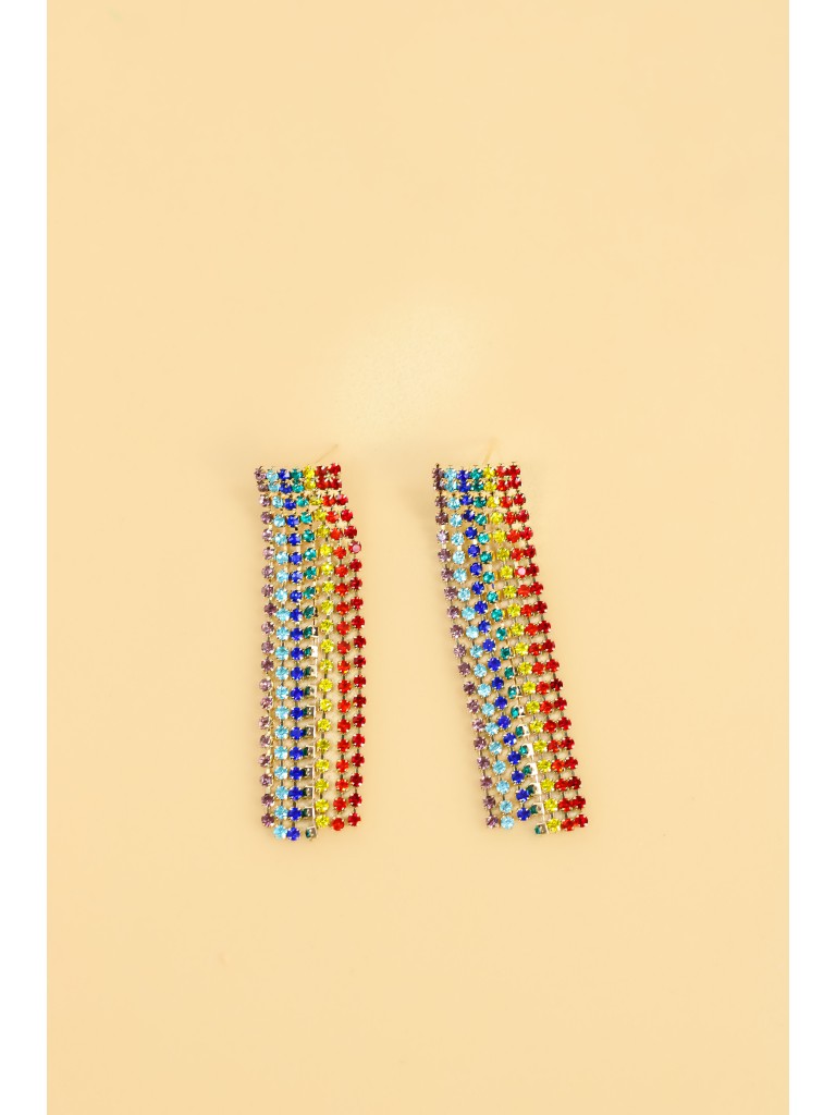 Brinco com base reta, caimento longo de franjas de strass colorido. Um belissimo brinco que veste muito bem e não pesa . A base por ser triangular, tem um otimo apoio. Acabamento em Metal. Fechamento em tarraxa.